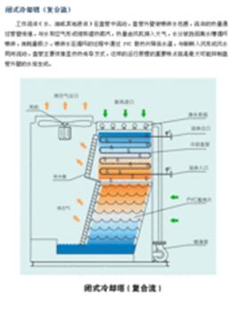 1、閉式冷卻塔實(shí)際上是一種蒸發(fā)式冷卻塔,冷卻器和濕式冷卻塔的組合,它是臥式的蒸發(fā)式冷卻塔,工藝流體在管內(nèi)流過(guò),空氣 在管外流過(guò),兩者互不接觸。閉式冷卻塔是傳統(tǒng)冷卻塔的一種變形和發(fā)展。塔底蓄水池內(nèi)的水由循環(huán)泵抽取后,送往管外均勻地噴淋下來(lái)。與工藝式流體熱水或制冷劑和管外空氣并不接觸,成為一種閉式冷卻塔,通過(guò)噴淋水增強(qiáng)傳熱傳質(zhì)的效果。